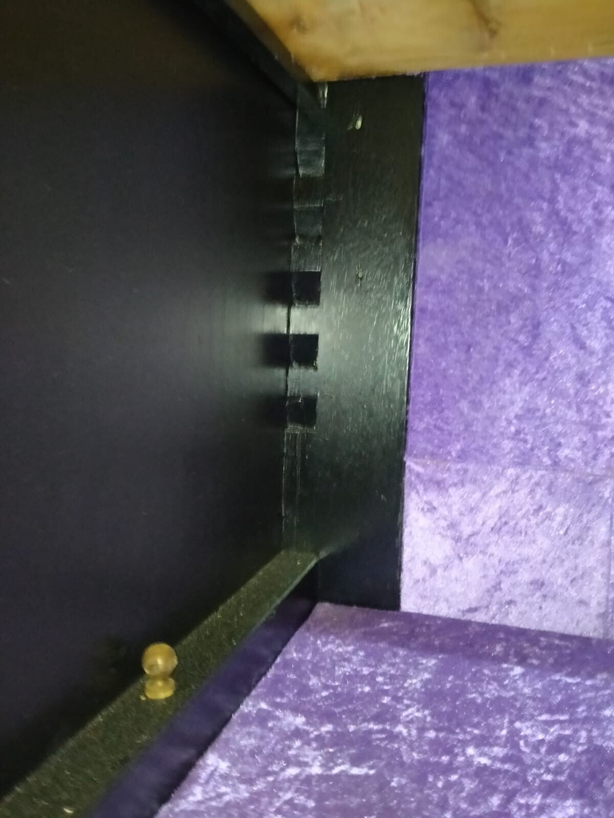De binnenkant is bekleed met fluweel. De deur en de la hebben een slot, de sloten werken en er horen 2 sleutels bij.